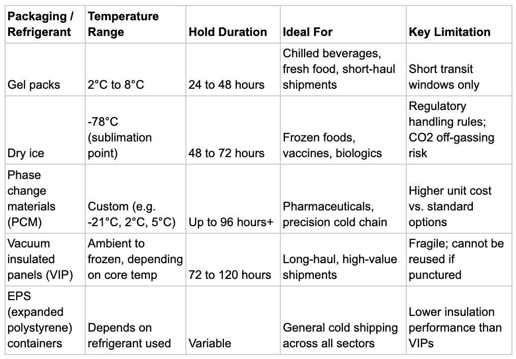 Choosing the right combination of insulation and refrigerant directly affects product safety, shipping costs, and transit flexibility. This table covers the most common options in cold chain shipping: