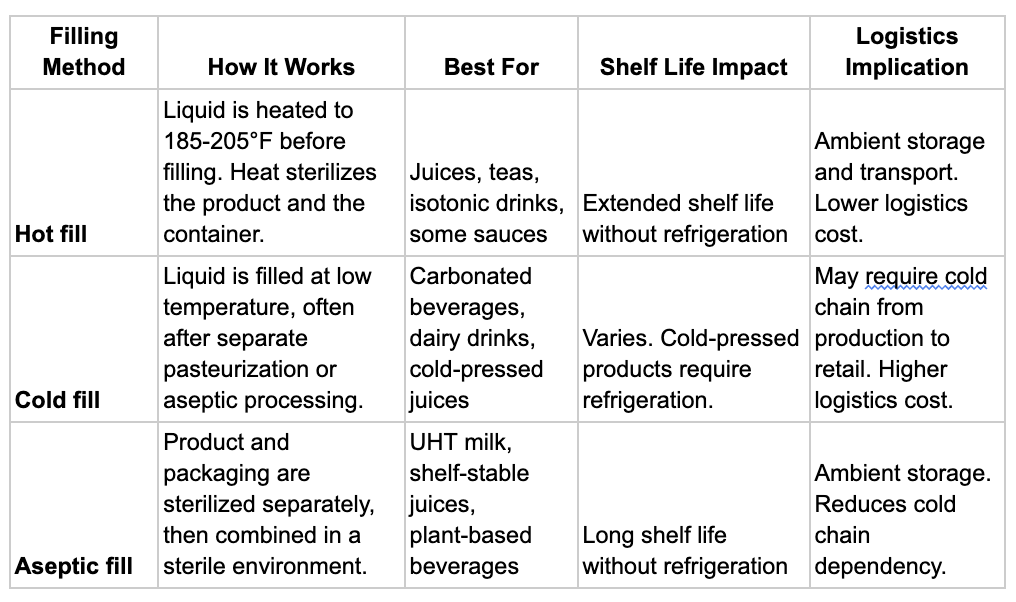The choice between hot fill, cold fill, and aseptic processing shapes the entire downstream supply chain. It determines what kind of warehouse is needed, what kind of trucks are required, and how far the product can travel before quality degrades. These are decisions that should be made with logistics in mind, not after the fact.