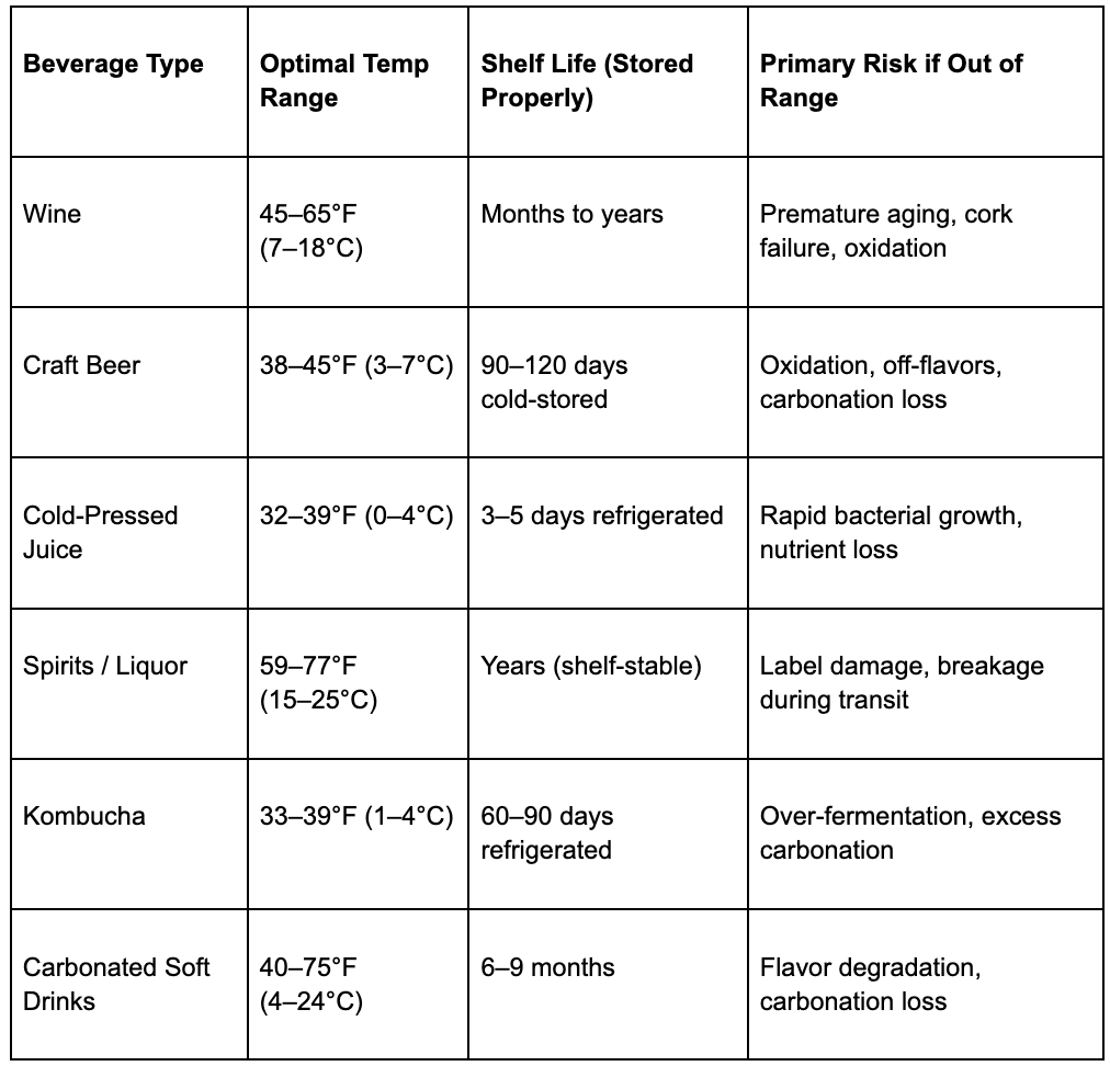 Note: Ranges are general guidelines. Always confirm the manufacturer's specific temperature requirements before shipping. For a deeper look at cold chain logistics across all beverage categories, see our full guide to beverage logistics.